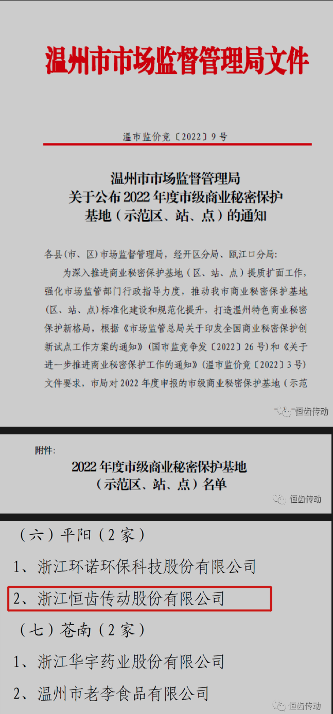 熱烈祝賀浙江恒齒傳動成功入選2022年度市級商業秘密保護示范點!